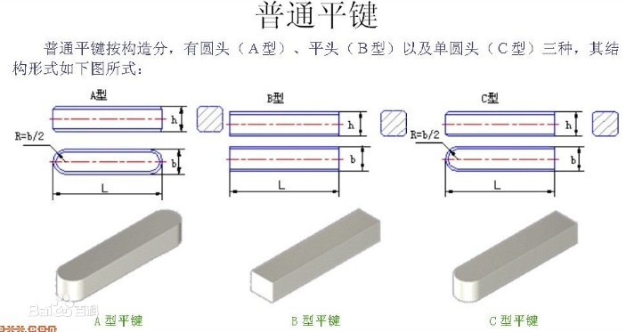 平鍵,是依靠兩個側面作為工作面,靠鍵與鍵槽側面的擠壓來傳遞轉矩的鍵。平鍵分為普通型平鍵、薄型平鍵、導向型平鍵三種。普通型平鍵對中性好,定位精度高,折裝方便,但無法實現(xiàn)軸上零件的軸向固定,用于高速或承受沖擊、變載荷的軸;薄型平鍵用于薄壁結構和傳遞轉矩較小的地方;導向型平鍵用螺釘把鍵固定在軸上,用于軸上的零件沿軸移動量不大的場合。